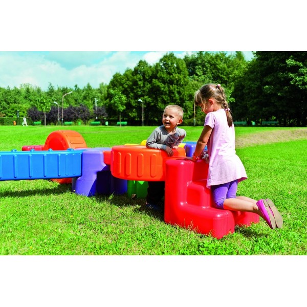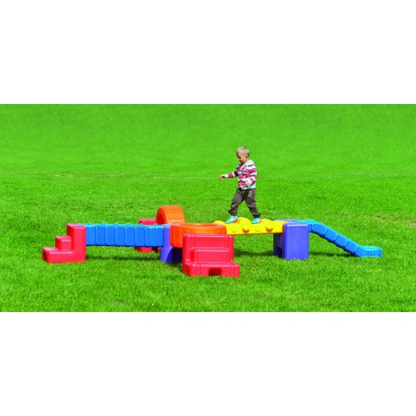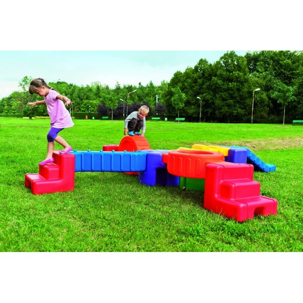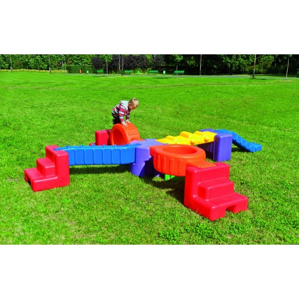 Assemblez votre parcours avec ces éléments colorés et très robustes. Pont, marches, tunnel, pente etc.. pourront être utilisés en extérieur comme en intérieur, partiellement ou tous connectés. Les motifs en reliefs de certains éléments formant des obstacles corseen la chose !