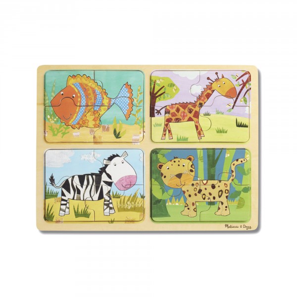 Planche de 4 puzzles de 4 pièces en bois sur le thème des animaux.