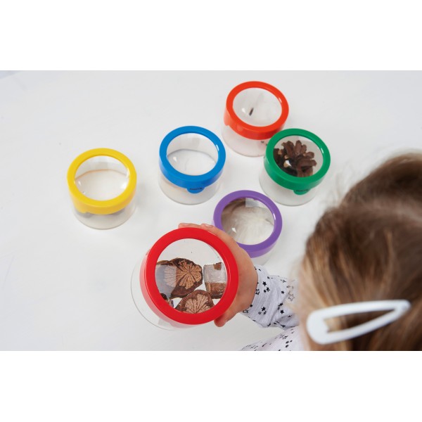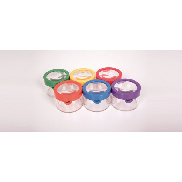 Un ensemble de pots d'observation avec une loupe dans les couvercles à pression aux couleurs vives. Idéal pour explorer de près les ressources naturelles.
