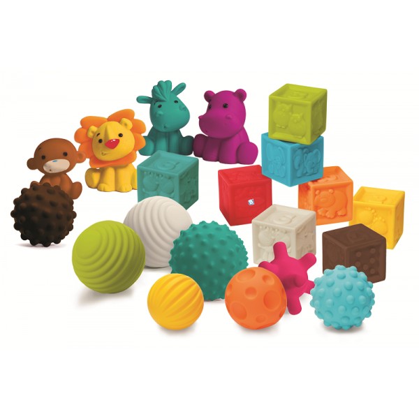 Coffret composé de 8 balles, 4 animaux et 8 cubes colorés flexible et souples.