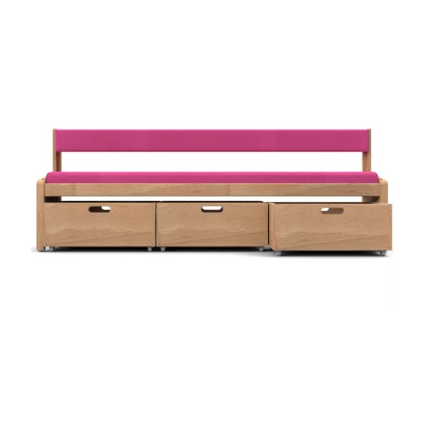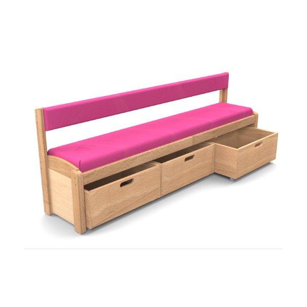 Un banc avec dossier très confortable lorsque les petits arrivent pour les déchausser et les bacs sur roulettes pour y ranger les chaussures ou les chaussons